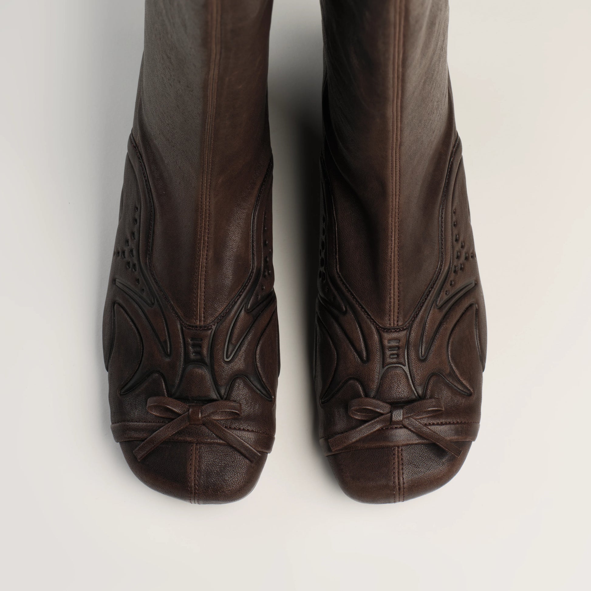 INVASIVE MODIFICATION SHOES ARE CRAFTED FROM HIGH-QUALITY HIDES AND HANDCRAFTED WITH PRECISION. EACH PAIR IS INDIVIDUAL, SLIGHT VARIATIONS IN COLOR, TEXTURE, OR MARKINGS ARE NATURAL FEATURES AND SHOULD NOT BE CONSIDERED IMPERFECTIONS. TO MAINTAIN THEIR ORIGINAL APPEARANCE OVER TIME: AVOID CONTACT WITH WATER, OILS, PERFUME, OR COSMETICS. IF DAMP, GENTLY DRY WITH A SOFT, LIGHT-COLORED CLOTH. WHEN SOLES OR HEELS SHOW WEAR, TAKE THEM TO A PROFESSIONAL FOR REPAIR OR TO ADD THIN PROTECTIVE RUBBER SOLES.
